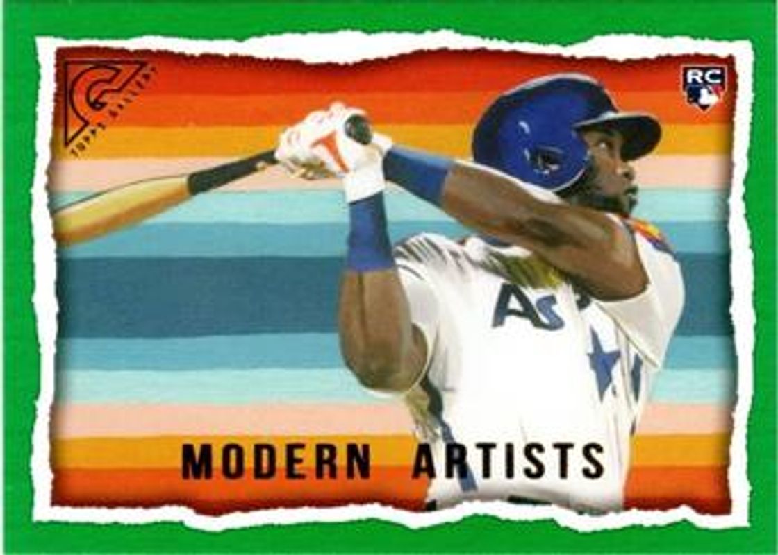 The Yordan Alvarez 2020 Topps Gallery #MP-13 Modern Artists - Green /250 Rookie card is 1 of 35 Yordan Alvarez's card variations in the 2020 Topps Gallery set being tracked by Sports Card Investor, including Base, Artist's Proofs, Rainbow Foil, Wood, and Private Issue /250.