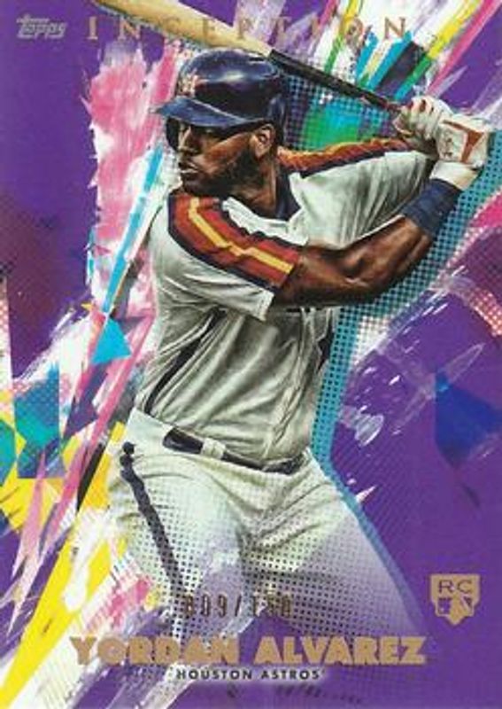 The Yordan Alvarez 2020 Topps Inception #25 Purple /150 Rookie card is 1 of 39 Yordan Alvarez's card variations in the 2020 Topps Inception set being tracked by Sports Card Investor, including Base, Green, Magenta /99, Red /99, and Orange /50.
