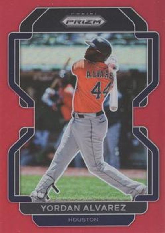 The Yordan Alvarez 2022 Prizm #66 Red card is 1 of 82 Yordan Alvarez's card variations in the 2022 Prizm set being tracked by Sports Card Investor, including Base, Blue, Blue Velocity, Carolina Blue, and Cosmic Haze.