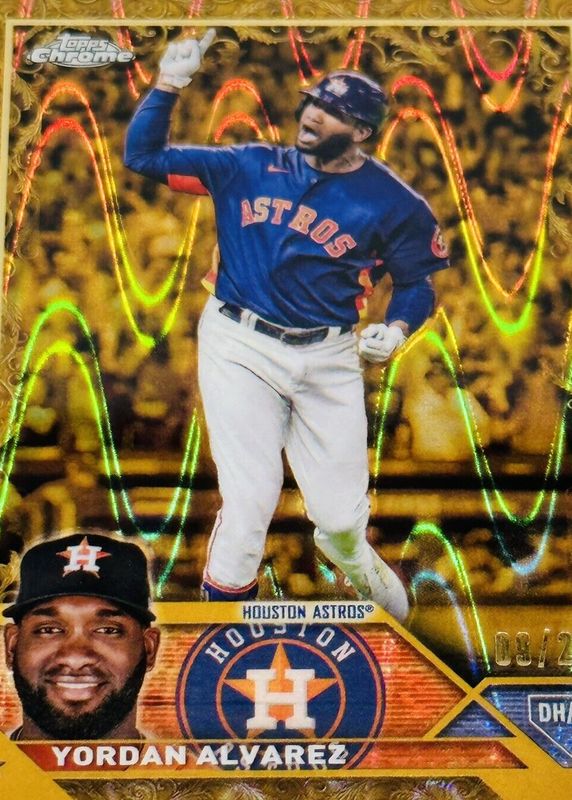 This card is 1 of 6 Yordan Alvarez's card variations in the 2023 Topps Gilded Collection set being tracked by Sports Card Investor, including Base /99, Wave Gold Etch Refractor /75, Mini-Diamond Gold Etch Refractor /50, Lava Gold Etch Refractor /10, and Superfractor /1.