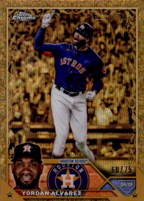 This card is 1 of 6 Yordan Alvarez's card variations in the 2023 Topps Gilded Collection set being tracked by Sports Card Investor, including Base /99, Mini-Diamond Gold Etch Refractor /50, RayWave Gold Etch Refractor /25, Lava Gold Etch Refractor /10, and Superfractor /1.