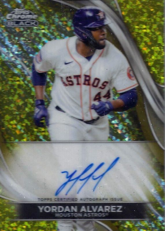 The Yordan Alvarez 2024 Topps Chrome Black #CBA-YA Autographs - Gold Mini-Diamond Refractor /50 card in Raw condition has not changed in price in the last 30 days and was last sold for $66.49 .