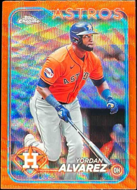 The Yordan Alvarez 2024 Topps Chrome #170 Orange Wave Refractor /25 card is 1 of 24 Yordan Alvarez's card variations in the 2024 Topps Chrome set being tracked by Sports Card Investor, including Base, Pink Refractor, X Fractor, Aqua Lava Refractor /199, and Aqua RayWave Refractor /199.