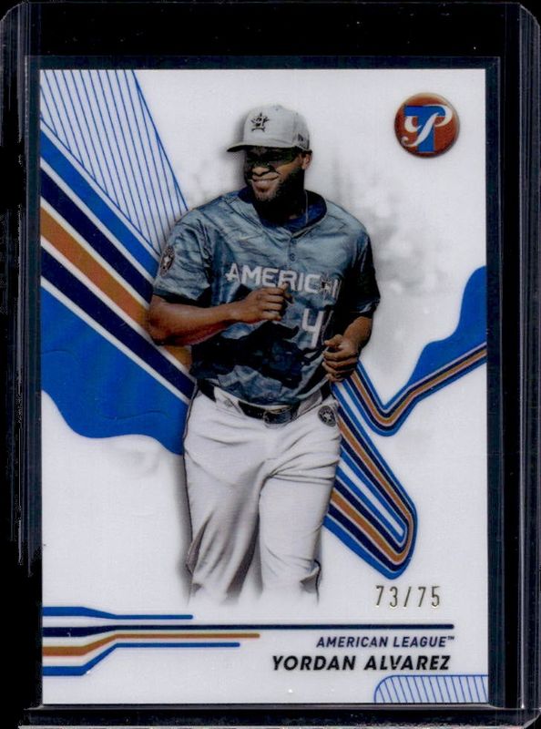 The Yordan Alvarez 2024 Topps Pristine #265 Blue Refractor /75 card is 1 of 53 Yordan Alvarez's card variations in the 2024 Topps Pristine set being tracked by Sports Card Investor, including #43 Base, #265 Base, #43 Pristine Refractor, #265 Pristine Refractor, and #265 Refractor.