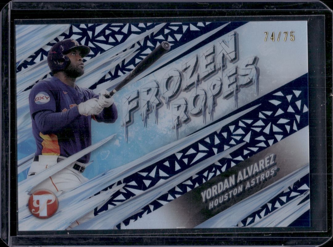 The Yordan Alvarez 2024 Topps Pristine #FR-21 Frozen Ropes - Blue Refractor /75 card is 1 of 53 Yordan Alvarez's card variations in the 2024 Topps Pristine set being tracked by Sports Card Investor, including #43 Base, #265 Base, #43 Pristine Refractor, #265 Pristine Refractor, and #265 Refractor.
