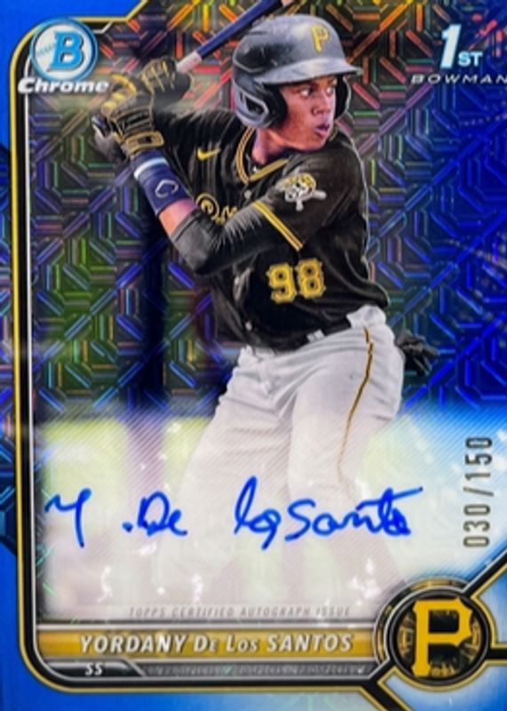 This card is 1 of 22 Yordany De Los Santos' card variations in the 2022 Bowman Chrome set being tracked by Sports Card Investor, including Prospect Auto (1st), Prospect Auto - Black & White Mini-Diamond Refractor (1st), Prospect Auto - Refractor /499 (1st), Prospect Auto - Speckle Refractor /299 (1st), and Prospect Auto - Purple Refractor /250 (1st).