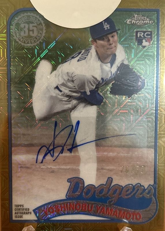 The Yoshinobu Yamamoto 2024 Topps Silver Pack #2T89C-26 1989 Chrome Promo Autographs - Gold Refractor (Series 2) /50 Rookie card in Raw condition has not changed in price in the last 30 days and was last sold for $772.00 .