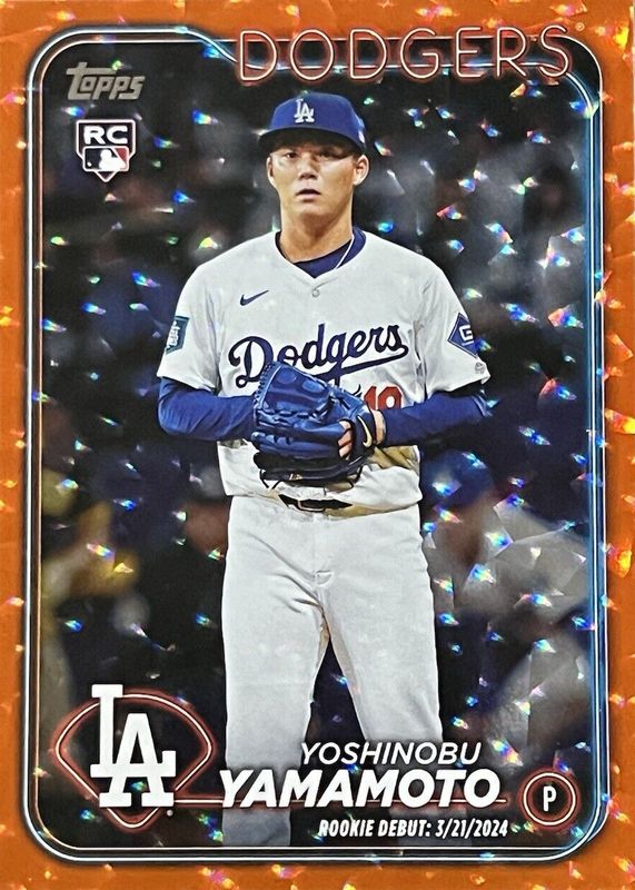 Best Prices Available For Sale of Yoshinobu Yamamoto 2024 Topps Update #US149 Rookie Debut - Orange Crackle Foilboard /299