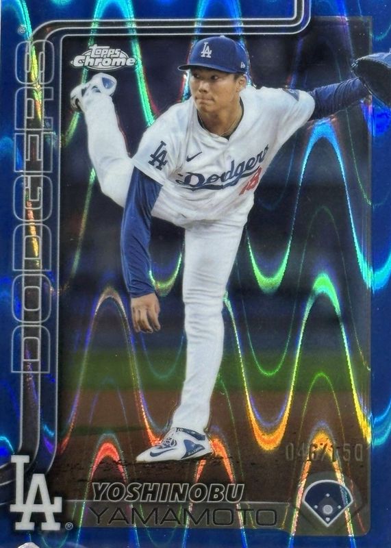 The Yoshinobu Yamamoto 2025 Topps Chrome #179 Blue RayWave Refractor /150 card in Raw condition has moved up $23.00 (+95.8%) in the last 30 days and was last sold for $47.00 .