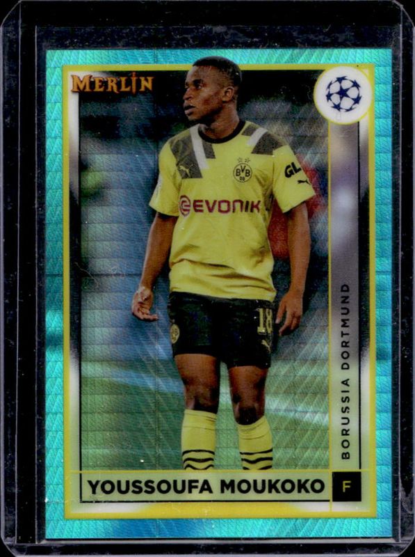 The Youssoufa Moukoko 2022 Topps Merlin Chrome UEFA Club Competitions #33 Aqua Prism Refractor card is 1 of 19 Youssoufa Moukoko's card variations in the 2022 Topps Merlin Chrome UEFA Club Competitions set being tracked by Sports Card Investor, including Base, Refractor, Vintage Merlin Refractor, Rose Gold Shimmer Refractor /299, and Pink Mojo Refractor /275.