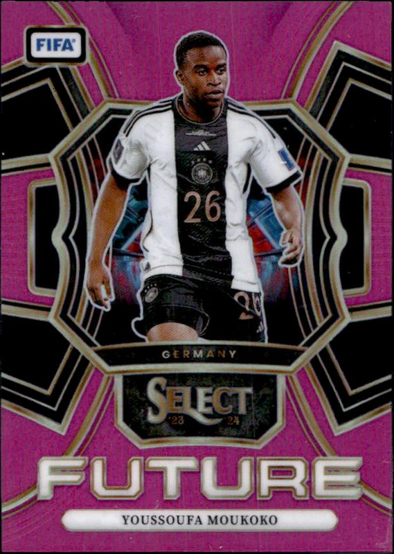 The Youssoufa Moukoko 2023 Select FIFA #18 Select Future Pink /25 card is 1 of 17 Youssoufa Moukoko's card variations in the 2023 Select FIFA set being tracked by Sports Card Investor, including Pitchside Signatures, Pitchside Signatures Blue Pulsar, Pitchside Signatures Peacock, Pitchside Signatures Red, and Select Future Blue Pulsar.
