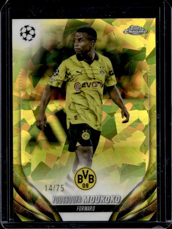 The Youssoufa Moukoko 2023 Topps Chrome UEFA Club Competitions Sapphire Edition #157 Yellow /75 card is 1 of 13 Youssoufa Moukoko's card variations in the 2023 Topps Chrome UEFA Club Competitions Sapphire Edition set being tracked by Sports Card Investor, including Base, Gold /50, Orange /25, Black /10, and Red /5.
