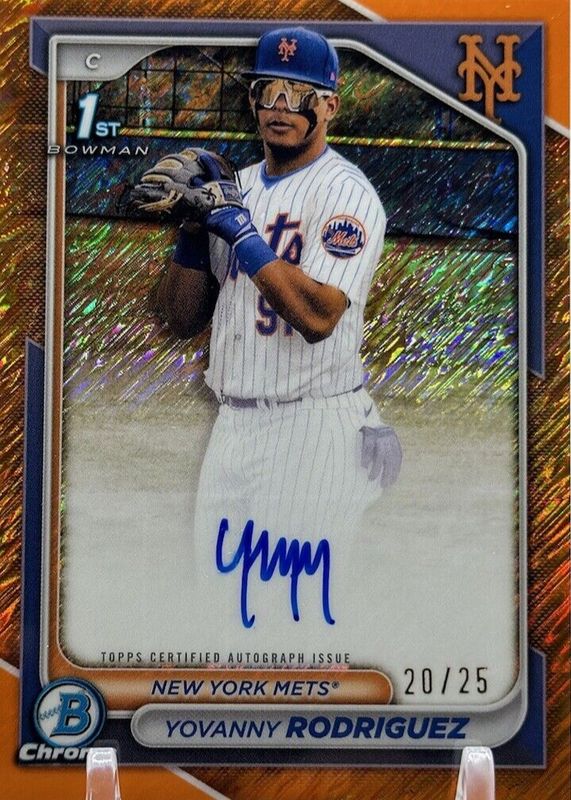 This card is 1 of 25 Yovanny Rodriguez's card variations in the 2024 Bowman Chrome set being tracked by Sports Card Investor, including Prospect Auto (1st), Prospect Auto - Refractor /499 (1st), Prospect Auto - Speckle Refractor /299 (1st), Prospect Auto - Purple Refractor /250 (1st), and Prospect Auto - Blue RayWave Refractor /150 (1st).