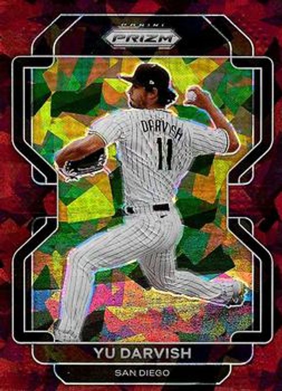 The Yu Darvish 2022 Prizm #180 Burgundy Cracked Ice /25 card is 1 of 38 Yu Darvish's card variations in the 2022 Prizm set being tracked by Sports Card Investor, including Base, Blue, Blue Velocity, Carolina Blue, and Cosmic Haze.
