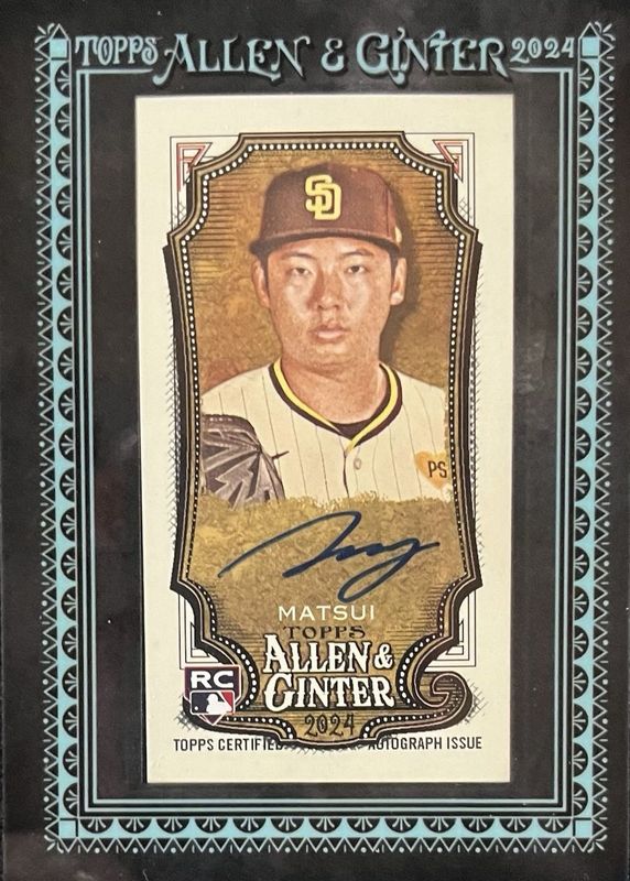 This card is 1 of 4 Yuki Matsui's card variations in the 2024 Topps Allen & Ginter set being tracked by Sports Card Investor, including Framed Mini Auto, Framed Mini Auto - Blue Frame /50, and Framed Mini Auto - Red Ink /10.