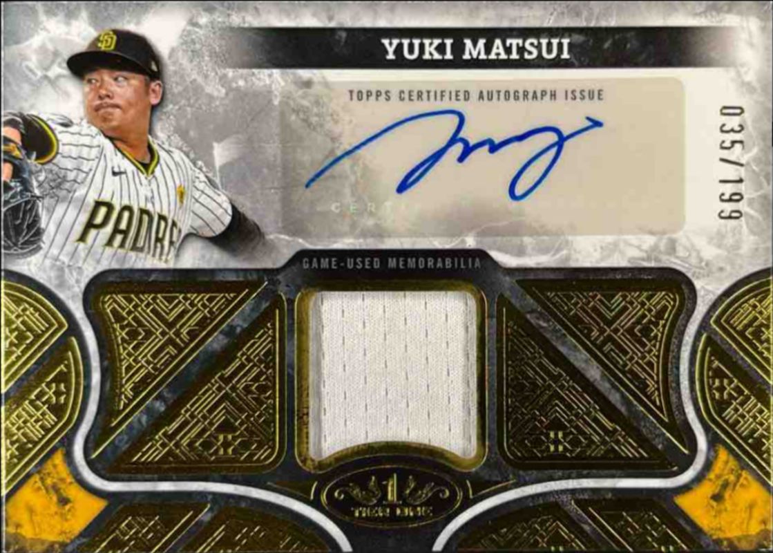 The Yuki Matsui 2025 Topps Tier One #AT1R-YM Autographed Tier One Relics /99 card is 1 of 6 Yuki Matsui's card variations in the 2025 Topps Tier One set being tracked by Sports Card Investor, including Autographed Tier One Relics - Dual /70, Autographed Tier One Relics - Triple /40, Autographed Tier One Relics - Dual Patch /10, Autographed Tier One Relics - Buttons /5, and Autographed Tier One Relics - Triple Patch /1.