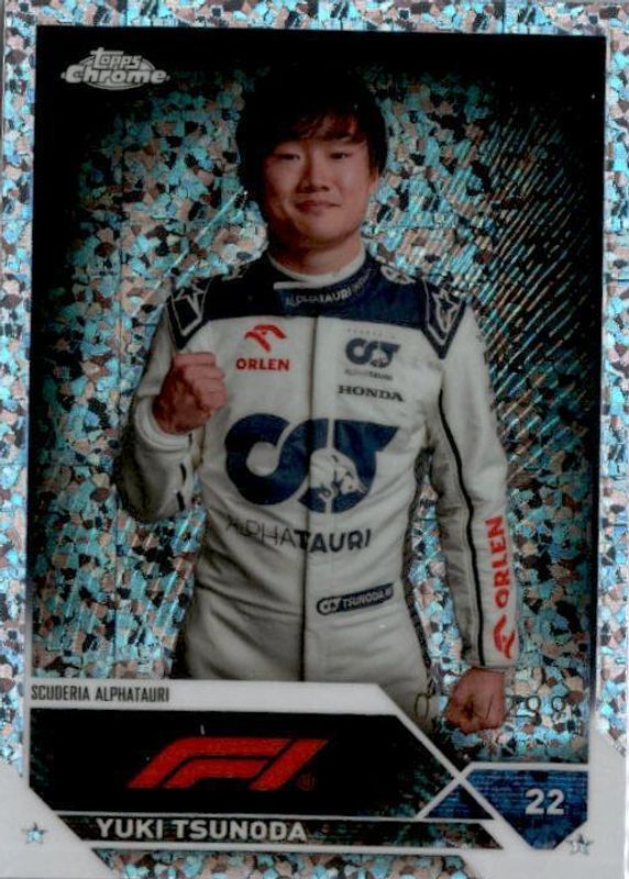 This card is 1 of 23 Yuki Tsunoda's card variations in the 2023 Topps Chrome Formula 1 set being tracked by Sports Card Investor, including Purple Refractor /399, Fuchsia Lava Refractor /250, Purple Checker Flag Refractor /199, Aqua Wave Refractor /150, and Green Refractor /99.