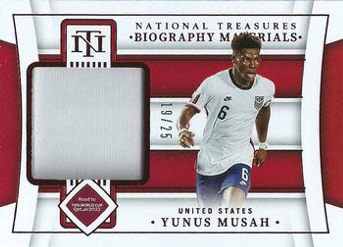 The Yunus Musah 2022 National Treasures World Cup #BM-YM Biography Materials - Ruby /25 card is 1 of 39 Yunus Musah's card variations in the 2022 National Treasures World Cup set being tracked by Sports Card Investor, including Base /99, Sapphire /25, Ruby /11, Gold /10, and Emerald /5.
