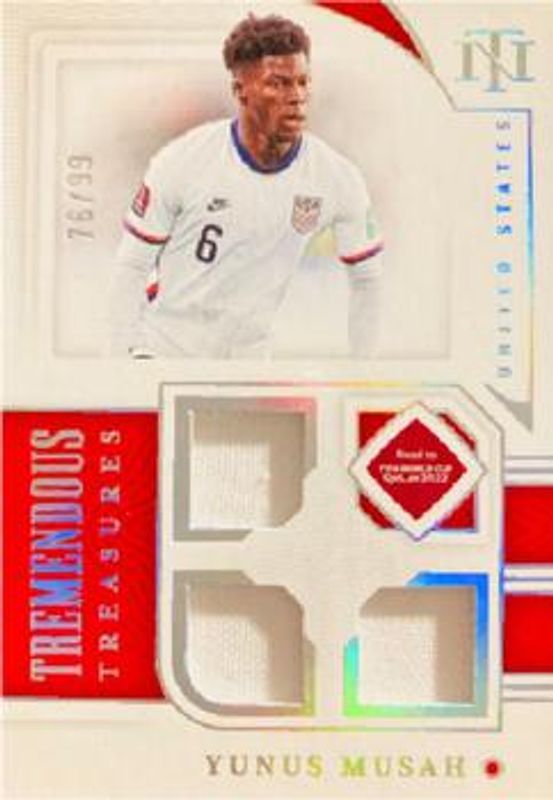 The Yunus Musah 2022 National Treasures World Cup #TT-YM Tremendous Treasures /99 card is 1 of 39 Yunus Musah's card variations in the 2022 National Treasures World Cup set being tracked by Sports Card Investor, including Base /99, Sapphire /25, Ruby /11, Gold /10, and Emerald /5.