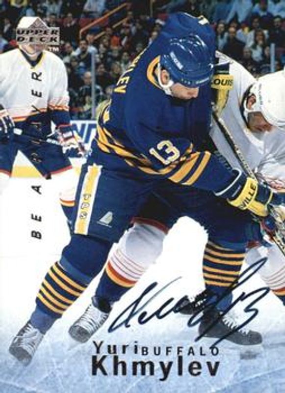 The Yuri Khmylev 1995 Upper Deck Be a Player #S4 Autographs card is 1 of 3 Yuri Khmylev's card variations in the 1995 Upper Deck Be a Player set being tracked by Sports Card Investor, including Base, and Autographs die-cut.