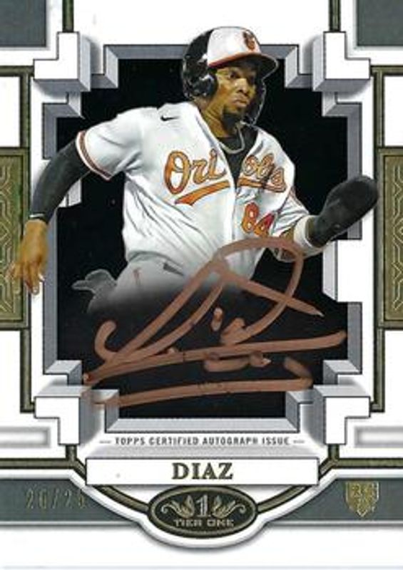 The Yusniel Diaz 2023 Topps Tier One #BOA-YD Break Out Autographs - Bronze Ink /25 Rookie card is 1 of 4 Yusniel Diaz's card variations in the 2023 Topps Tier One set being tracked by Sports Card Investor, including Break Out Autographs /299, Break Out Autographs - Silver Ink /10, and Break Out Autographs - Gold Ink /1.