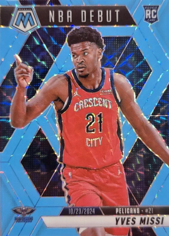 The Yves Missi 2024 Mosaic #255 NBA Debut - Blue Fluorescent /75 Rookie card in Raw condition has not changed in price in the last 30 days and was last sold for $5.21 .