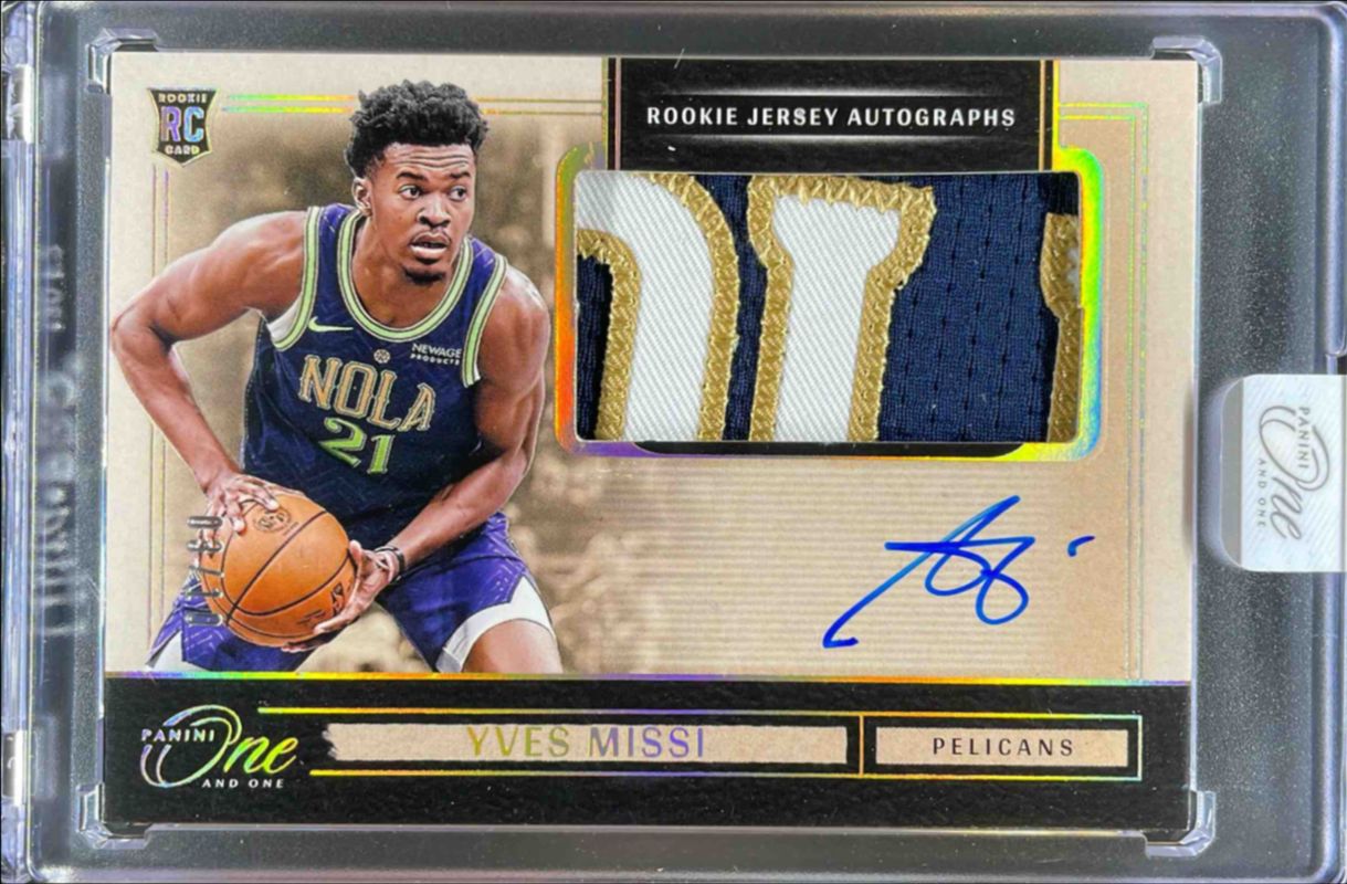 The Yves Missi 2024 One and One #5 Rookie Jersey Autographs - Gold /10 card is 1 of 49 Yves Missi's card variations in the 2024 One and One set being tracked by Sports Card Investor, including Precision Jersey Autographs /99, Rookie Autographs /99, Rookie Jersey Autographs /99, Rookie Jumbo Jersey Autographs /99, and Rookies /75.