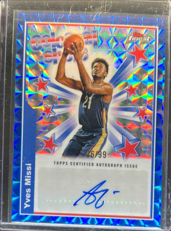 The Yves Missi 2024 Topps Finest #BSA-YM Colossal Shots Autographs - Blue Geometric Refractor /99 Rookie card is 1 of 117 Yves Missi's card variations in the 2024 Topps Finest set being tracked by Sports Card Investor, including Arrivals, Arrivals - Geometric Refractor, Arrivals - Refractor, Arrivals - X-Fractor, and Base Rare.