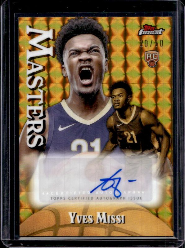 The Yves Missi 2024 Topps Finest #MA-YM Masters Autographs - Gold Geometric Refractor /50 Rookie card is 1 of 117 Yves Missi's card variations in the 2024 Topps Finest set being tracked by Sports Card Investor, including Arrivals, Arrivals - Geometric Refractor, Arrivals - Refractor, Arrivals - X-Fractor, and Base Rare.