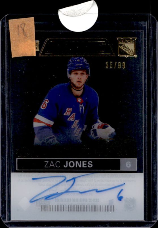 The Zac Jones 2021 Upper Deck Credentials #DTA-ZJ Debut Ticket Access Acetate Autographs /99 Rookie card is 1 of 22 Zac Jones' card variations in the 2021 Upper Deck Credentials set being tracked by Sports Card Investor, including Base /999, Yellow /249, Red /199, Orange /149, and Blue /99.