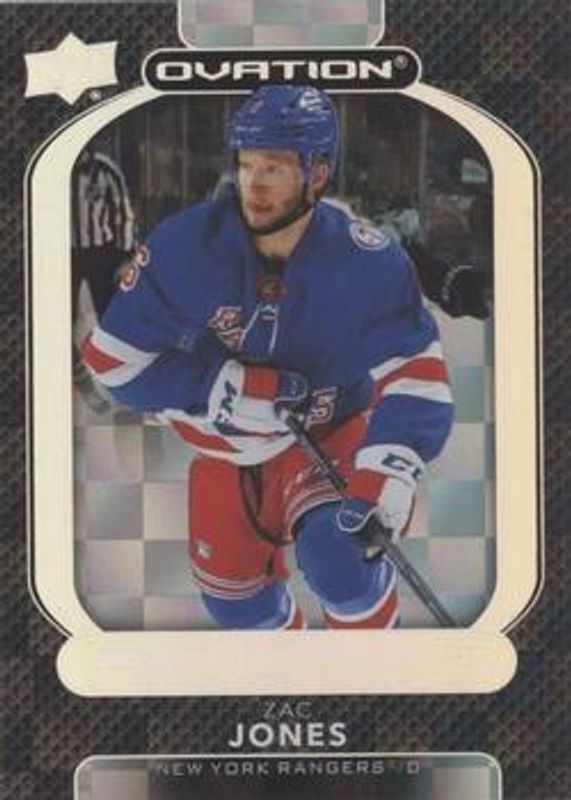 The Zac Jones 2021 Upper Deck Ovation #111 Checkerboard Rookie card is 1 of 29 Zac Jones' card variations in the 2021 Upper Deck Ovation set being tracked by Sports Card Investor, including Base, Gold Circular Wonder, Gold Foil, Silver Foil, and Standing Ovation /500.