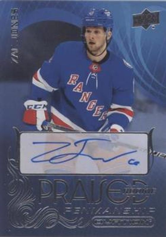 The Zac Jones 2021 Upper Deck Ovation #PRP-ZJ Praised Rookie Penmanship card is 1 of 29 Zac Jones' card variations in the 2021 Upper Deck Ovation set being tracked by Sports Card Investor, including Base, Checkerboard, Gold Circular Wonder, Gold Foil, and Silver Foil.
