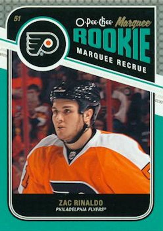 The Zac Rinaldo 2011 O-Pee-Chee #562 Base Rookie card is 1 of 5 Zac Rinaldo's card variations in the 2011 O-Pee-Chee set being tracked by Sports Card Investor, including Rainbow, Retro, Retro Blank Back, and Black Rainbow /100.