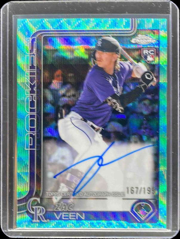 The Zac Veen 2025 Topps Chrome Update #RA-ZV Autographs - Aqua Wave Refractor /199 Rookie card is 1 of 128 Zac Veen's card variations in the 2025 Topps Chrome Update set being tracked by Sports Card Investor, including #USC186 Base, #USC28 Base, #USC186 Geometric Refractor, #USC28 Geometric Refractor, and #USC28 Negative Refractor.