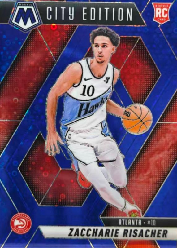 The Zaccharie Risacher 2024 Mosaic #274 City Edition - Fast Break Blue /85 Rookie card in Raw condition has moved up $4.00 (+88.9%) in the last 30 days and was last sold for $8.50 .