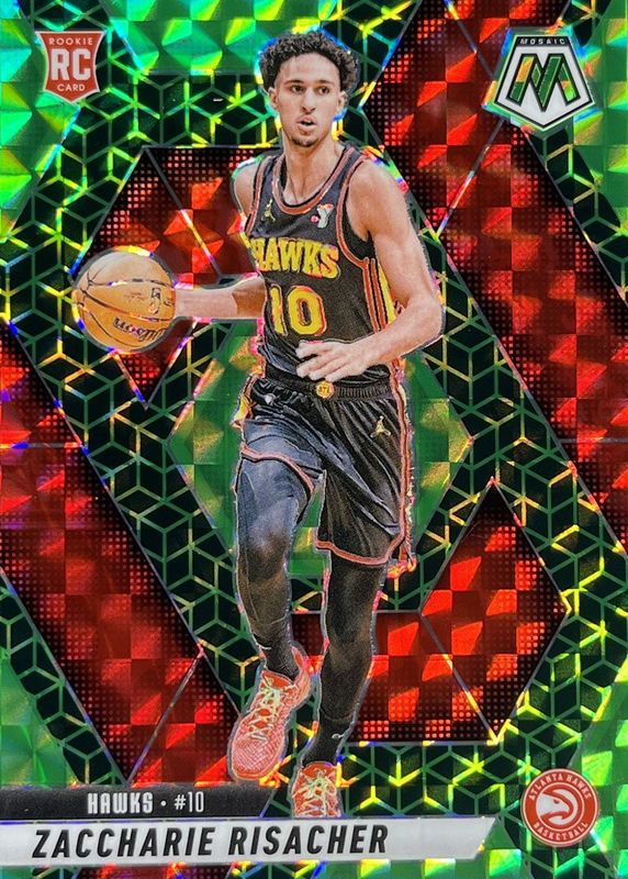 The Zaccharie Risacher 2024 Mosaic #213 Spectris Green FOTL /5 Rookie card in Raw condition has not changed in price in the last 30 days and was last sold for $125.50 .