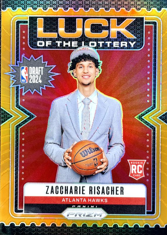 The Zaccharie Risacher 2024 Prizm #10 Luck of the Lottery - Orange /49 Rookie card in Raw condition has not changed in price in the last 30 days and was last sold for $19.40 .