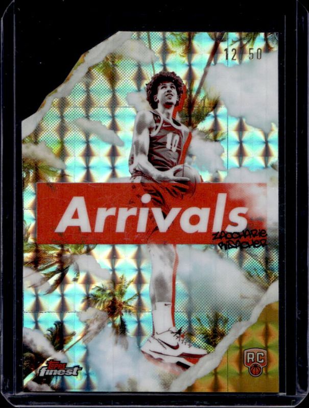 The Zaccharie Risacher 2024 Topps Finest #A-4 Arrivals - Gold Geometric Refractor /50 Rookie card is 1 of 153 Zaccharie Risacher's card variations in the 2024 Topps Finest set being tracked by Sports Card Investor, including Arrivals, Arrivals - Geometric Refractor, Arrivals - Refractor, Arrivals - X-Fractor, and Base Common.