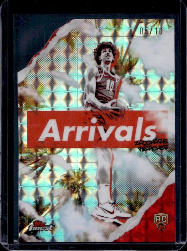 The Zaccharie Risacher 2024 Topps Finest #A-4 Arrivals - Red Geometric Refractor /10 Rookie card is 1 of 153 Zaccharie Risacher's card variations in the 2024 Topps Finest set being tracked by Sports Card Investor, including Arrivals, Arrivals - Geometric Refractor, Arrivals - Refractor, Arrivals - X-Fractor, and Base Common.
