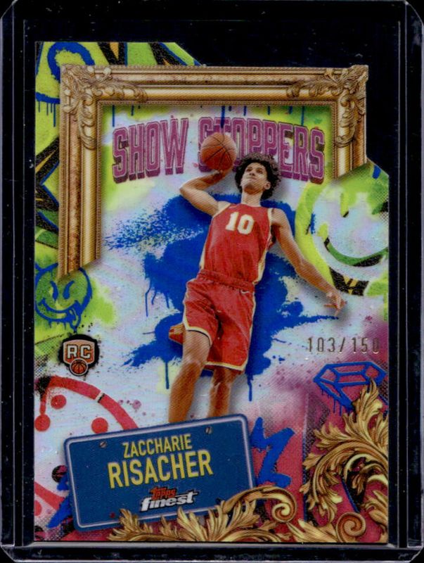 The Zaccharie Risacher 2024 Topps Finest #S-23 Showstoppers - Blue Refractor /150 Rookie card is 1 of 153 Zaccharie Risacher's card variations in the 2024 Topps Finest set being tracked by Sports Card Investor, including Arrivals, Arrivals - Geometric Refractor, Arrivals - Refractor, Arrivals - X-Fractor, and Base Common.