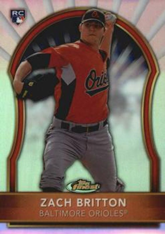 The Zach Britton 2011 Topps Finest #84 Refractor /549 Rookie card is 1 of 46 Zach Britton's card variations in the 2011 Topps Finest set being tracked by Sports Card Investor, including Base, X-Fractor /299, Green Refractor /199, Orange Refractor /99, and Gold Refractor /50.
