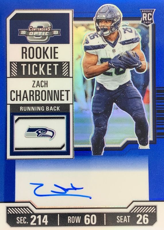 2023 Panini Contenders Optic Zach Charbonnet Blue Rookie Ticket On Card Auto /75