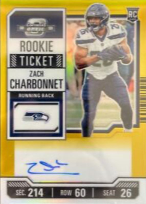 Auctions Ending Soon for Zach Charbonnet 2023 Contenders Optic #141 Rookie Ticket Auto - Gold /10 RAW