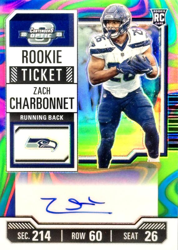 Best Prices Available For Sale of Zach Charbonnet 2023 Contenders Optic #141 Rookie Ticket Auto - Neon Marble /4