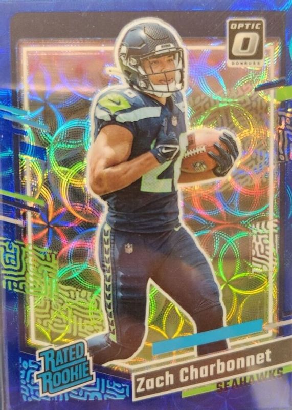 The Zach Charbonnet 2023 Donruss #392 Optic Preview - Blue Scope Rookie card in Raw condition has moved up $2.75 (+275%) in the last 30 days and was last sold for $3.75 .