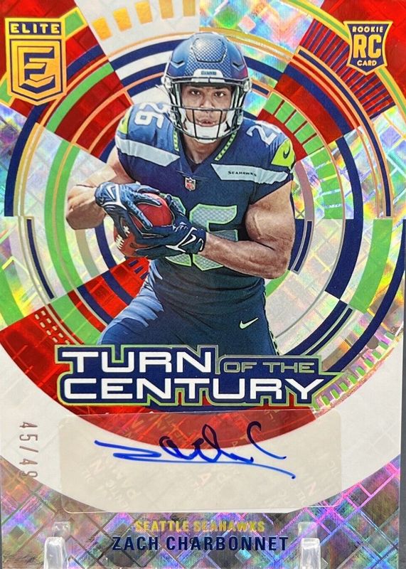 The Zach Charbonnet 2023 Elite #TC-ZAC Turn of the Century Autographs - Red /49 Rookie card in Raw condition has not changed in price in the last 30 days and was last sold for $6.00 .