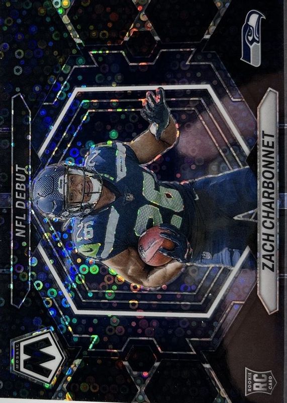 The Zach Charbonnet 2023 Mosaic #ND-11 NFL Debut - No Huddle Black /1 Rookie card in Raw condition has not changed in price in the last 30 days and was last sold for $250.00 .