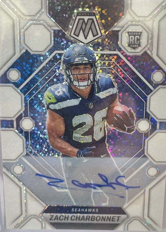Auctions Ending Soon for Zach Charbonnet 2023 Mosaic #379 Rookie Autographs - White Sparkle /1 RAW