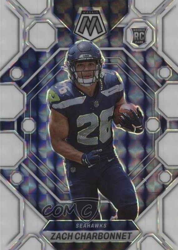 This card is 1 of 96 Zach Charbonnet's card variations in the 2023 Mosaic set being tracked by Sports Card Investor, including Base, NFL Debut, Choice Red & Green, Green, and Mosaic.