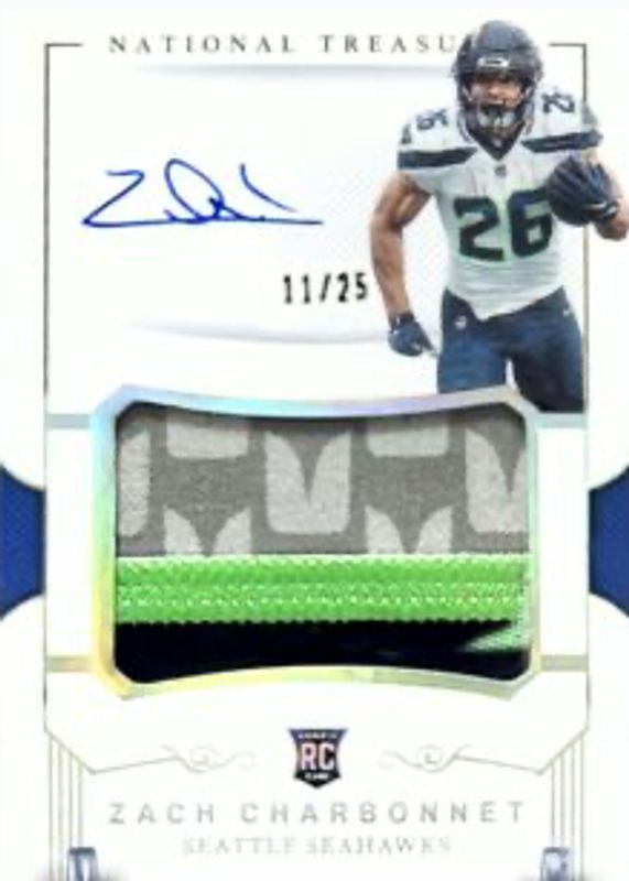 This card is 1 of 38 Zach Charbonnet's card variations in the 2023 National Treasures set being tracked by Sports Card Investor, including Rookie Material Signatures - Green Jersey Number (/26), Rookie Patch Auto - Green Jersey Number (/26), Crossover Rookie Patch Autographs /99, Rookie Material Signatures /99, and Rookie Patch Auto /99.